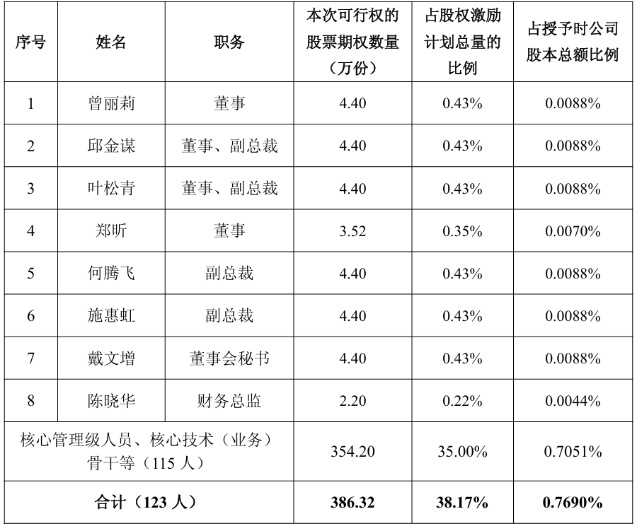 根据公告,公司本次股票期权激励计划的第一个行权期可行权数量为386万份,行权人数为123人,行权价格为13.56元/份(调整后),激励对象名单及行权情况: