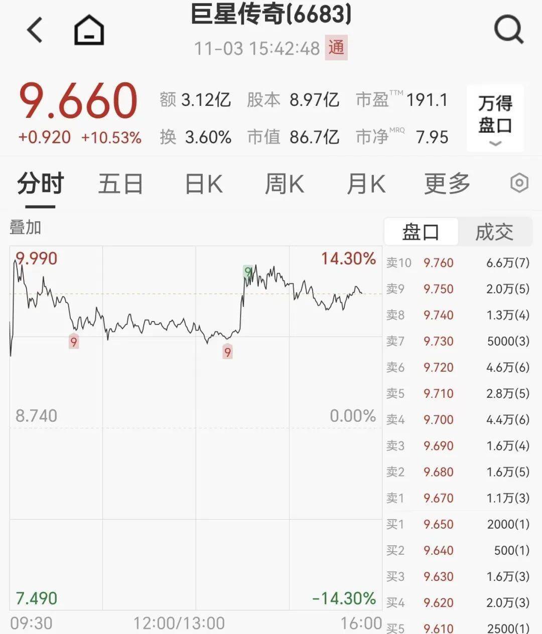 受此消息刺激,巨星传奇今日股价大幅高开,盘中涨幅一度达到14.3%,截至15:42,涨幅超10%,市值达86.7亿港元。